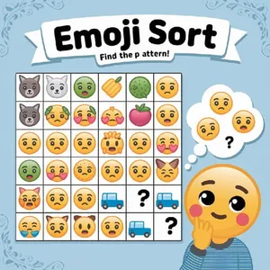 Emoji Sort is a pattern recognition puzzle game where players must fill in empty cells with the correct emojis. Each puzzle presents a grid with missing emojis that follow specific patterns - such as categories, sequences, or associations. Players analyze the existing emojis to identify the pattern (animals, food chains, transportation types, etc.) and select the appropriate emojis to complete the grid. The game features 30 increasingly challenging levels with various pattern types, and includes a hint system to help when players get stuck. Perfect for puzzle enthusiasts who enjoy discovering logical connections between visual elements!