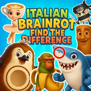 Italian Brainrot: Find the Difference is a fast, funny, and bizarre puzzle game where absurdity meets sharp-eyed fun. Each of the 30 levels features two nearly identical images—but with small, sneaky changes hidden in plain sight. Designed especially for kids, this game brings together cartoon chaos and visual brain-training in a way that’s goofy, creative, and totally unforgettable. You’re not just spotting differences—you’re diving into a wild universe full of absurd characters and hilarious scenes. 🧠 How It Works 30 handcrafted levels with detailed, funny illustrations Each level has 5 differences to find No timers, no pressure—perfect for kids and families Play directly in-browser on mobile or desktop 🎭 Key Characters in the Italian Brainrot Universe Tralalero Tralala A three-legged shark always rocking bright Nike sneakers. Whether he's leaping through chaos or fighting with Bombardino Crocodilo, he's full of attitude and absurd energy. Bombardino Crocodilo A crocodile-headed creature with the body of a WWII bomber plane. He drops more confusion than bombs and makes every level feel like a fever dream. Tung Tung A living, walking wooden drum (inspired by Indonesian bedug) with a baseball bat. While sometimes mistaken as Italian Brainrot, he’s a crossover character who adds international flair to the madness. Ballerina Cappuccina A graceful dancer with a cappuccino cup for a head. She pirouettes through scenes of total nonsense, highlighting the game’s charming chaos